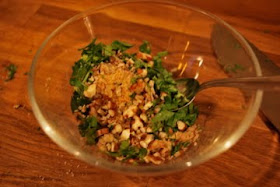 Kabocha squashes are amazing. They're low moisture so they're perfect for making gnocchi. They also play nicely with other fruits and vegetables--like right here in this spiced bake. Kabocha squash is a lot like pumpkin as far as density goes. Get a cleaver and whack yours open.Scoop out the seeds, peel and cube it as best you can. I'm not showing any pictures of that process because it was hard to do and a total bloodbath for the squash halves. Here's the fairly attractive aftermath though--nice little chunks of kabocha squash.Toss with salt, pepper, 1 tablespoon olive oil and 1/4 cup chicken stock. Set it to bake at 400 for about 45 minutes, stirring occasionally.Here's what it looks like afterwards--the cubes should be soft but not too mushy.Meanwhile, get 1/4 cup of golden raisins...